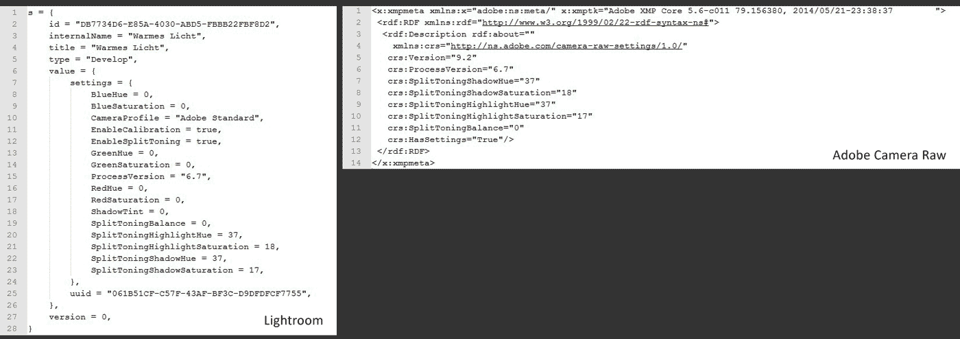 Die eine Möglichkeit identische Entwicklungs-Vorgaben für Lightroom und Photoshop zu erstellen ist der direkte Eingriff in die XML-Programmierung (XML ist die Sprache, in der die XMP-Dateien codiert sind). Dazu brauchen Sie genaue Kenntnisse der XML-Spezifikationen der beiden XMP-Typen, denn Lightroom und Photoshop, beziehungsweise Adobe Camera Raw nutzen dazu eine deutlich von voneinander abweichende Nomenklatur.