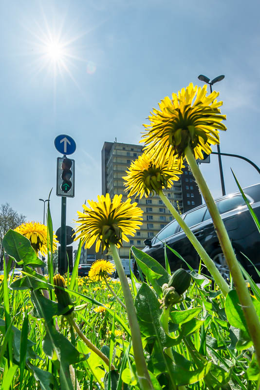 Löwenzahn auf dem Grünstreifen einer Bundesstraße.